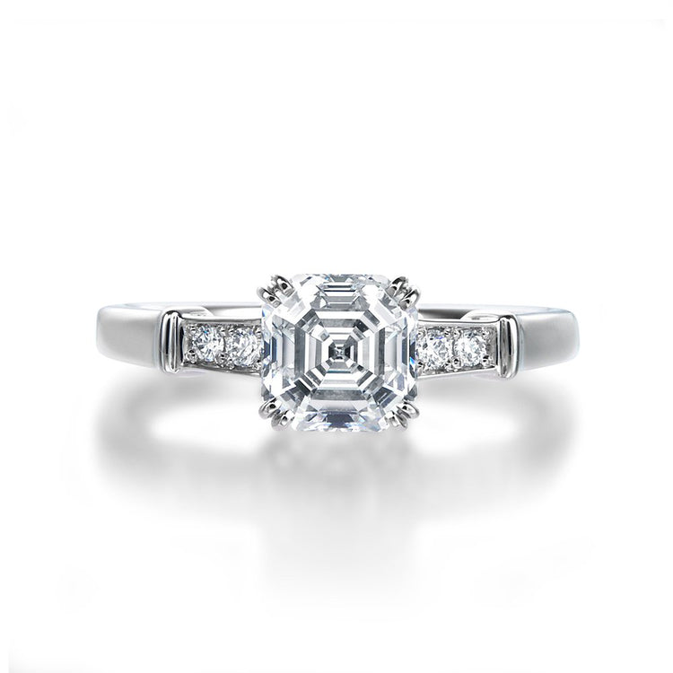 カッティングジュエリーブランド「ロイヤル・アッシャー」の象徴ともいえる「ロイヤル・アッシャー・カット」を施したダイヤモンドリング。74面のファセットを持つこの独創的なカットは、ステップカットの特徴である上品で透明感のある輝きに加え、戻ってくる光の総量がさらに多くなるよう考案されました。腕部分に施されたメレーダイヤモンドが、リング全体を一層華やかな印象にしています。