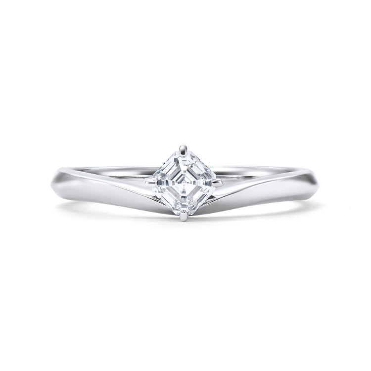 ロイヤル・アッシャー・カットを両サイドからそっと包み込むような優しいフォルムで、サイドから見たときのたたずまいも美しく、ダイヤモンドの美しさを堪能いただけます。