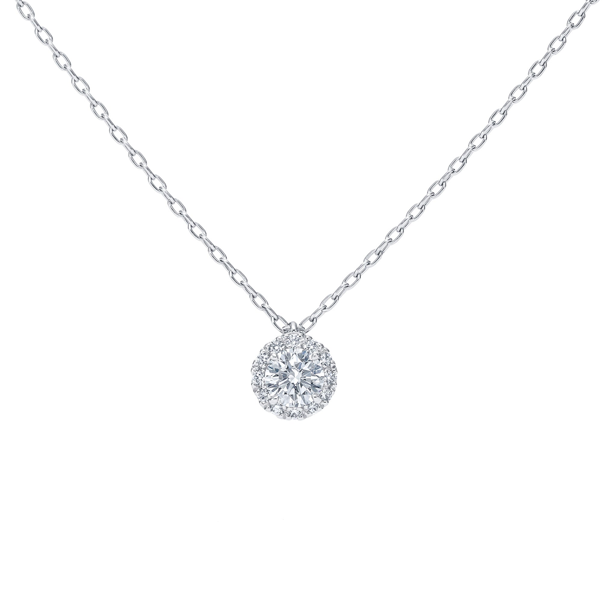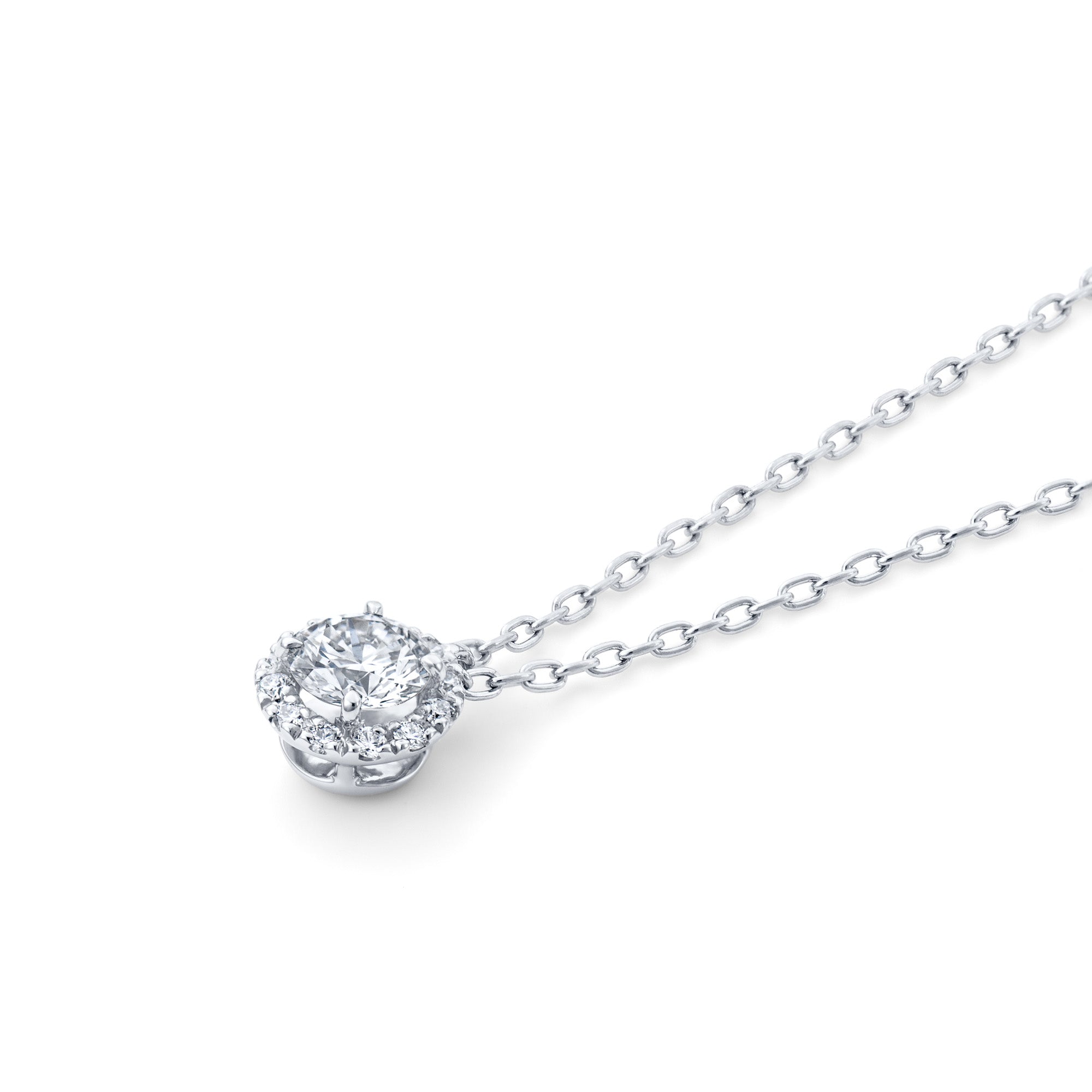 センターストーンを取り巻くようにメレダイヤモンドを緻密にセッティングしたエンゲージペンダント。上品で透明感のあるその姿はまるで可憐に咲く花のようです。