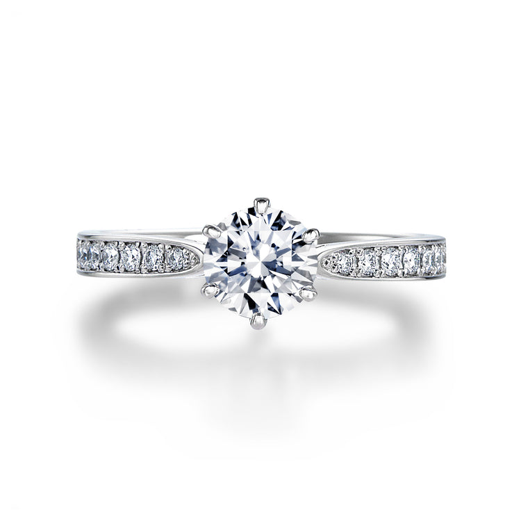 ソリテールリングとハーフエタニティリング、 双方のニュアンスを楽しめるワンランク上のデザイン。 ロイヤル・アッシャー・ダイヤモンドらしい 贅沢な輝きを堪能できます。細身のアームで、 ほかのリングとコーディネートしやすいこともポイント。