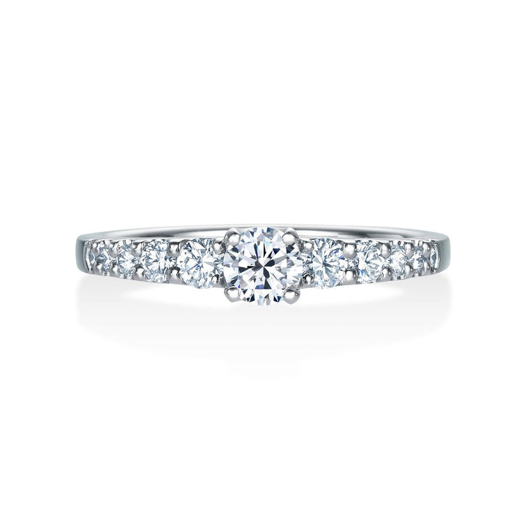 センターダイヤモンドをそっと包み込むようにメレーダイヤモンドをセッティング。ゴージャスなデザインと輝きを求める人にぴったりのリングです。ロイヤル・アッシャーのこだわりを随所に感じさせるデザイン。