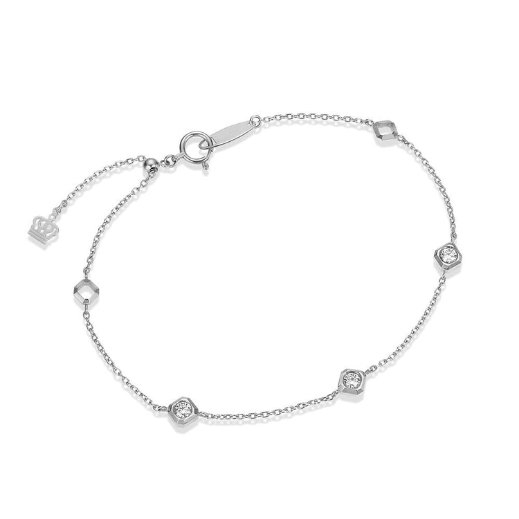 ロイヤル・アッシャー・カットを模した立体的なスクエアシェイプの地金に、3石のダイヤモンドをバランスよく配置したブレスレット。