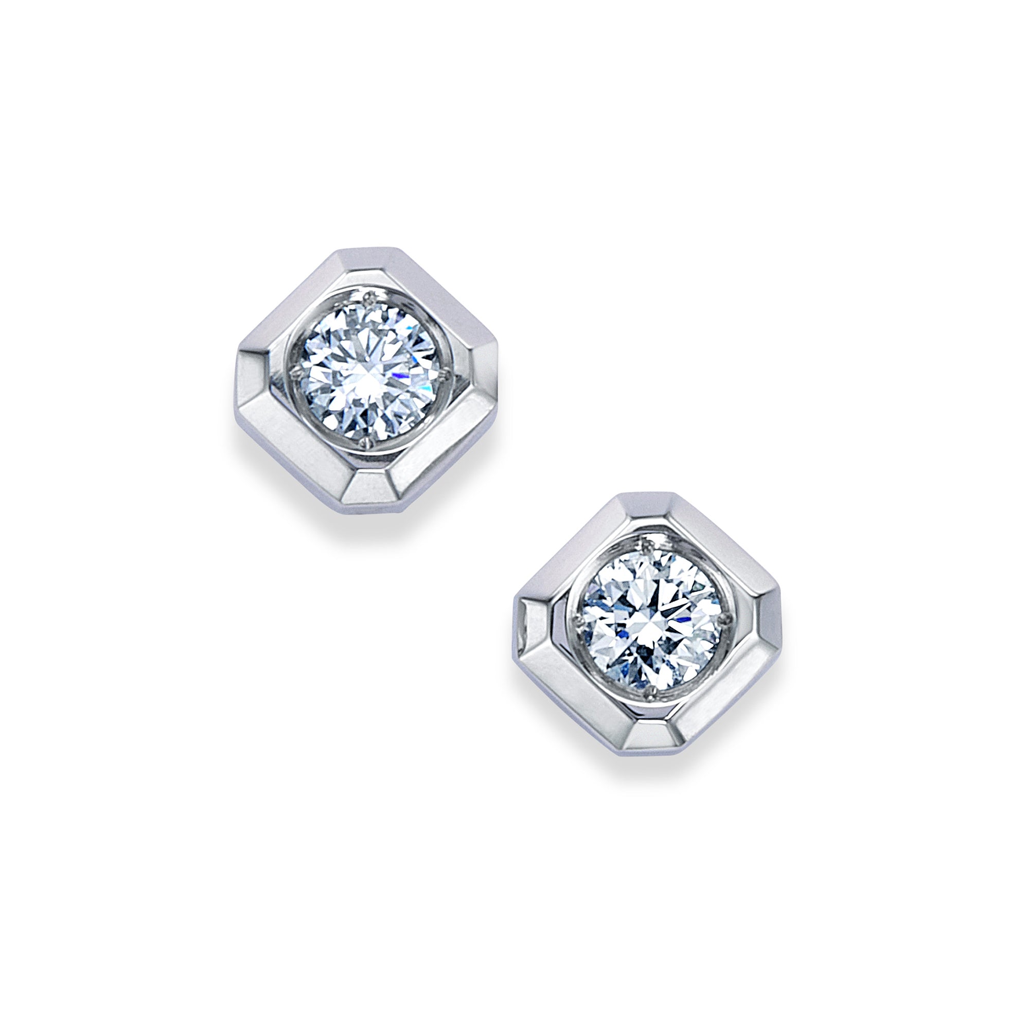 ロイヤル・アッシャー・カットを模したスクエアシェイプのプラチナにダイヤモンドを施したピアス。立体的なフォルムが地金とダイヤモンドの輝きに奥行きを与えてくれます。