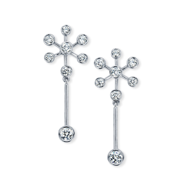 グラフィカルな存在感がひときわ目を引くピアス。中央からランダムに伸びる放射線状のバーに、ダイヤモンドを施し、無機質ながらも洗練された“モダンライト”を描きました。一つ一つの配置やバランスを計算し、高低差をつけることで立体的な奥行きを生み出したデザインです。