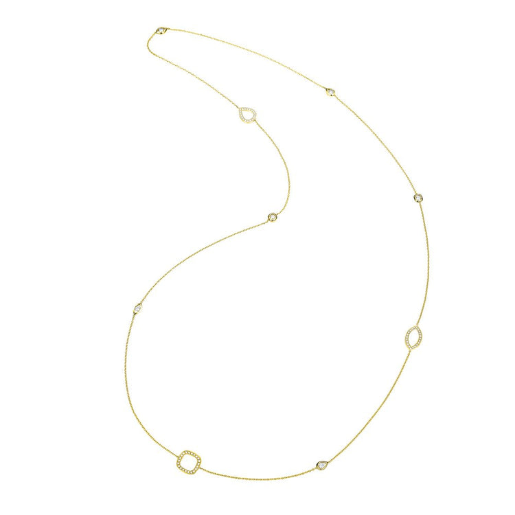 世界最大のダイヤモンド原石「カリナン」からカットされた9石の大粒ダイヤモンドをモチーフにした、ロングステーションネックレス。マーキスカット、クッションカット、ペアシェイプカットなどの、大小異なる9つのパーツを均等に配置し、胸元を軽やかな印象に仕上げました。中央部を透かした清涼感溢れるユニークなパーツのコンビネーションは、石留めにも工夫を凝らし、表面はブランドの代名詞でもある白く高貴に輝くダイヤモンドを、裏面は丹念にポリッシュした鏡面仕上げと地金をランダムに配しています。