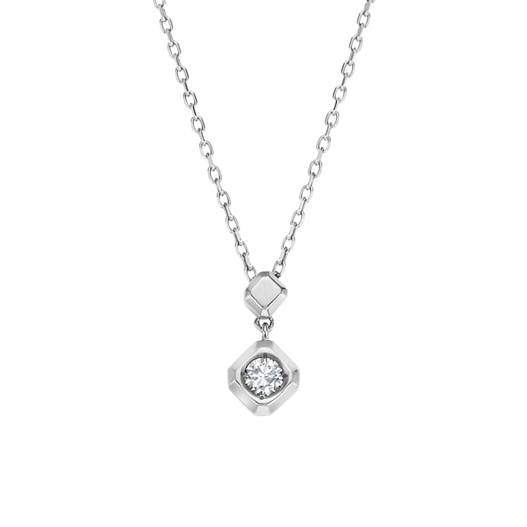 ロイヤル・アッシャー・カットを模した立体的なスクエアシェイプを縦に配置したダイヤモンドペンダント。先端は1石のダイヤモンドを施し、体の動きに合わせてわずかに揺れる設計によりスタイルに奥行きを与えています。温かみのあるピンクゴールドは優しい印象に。