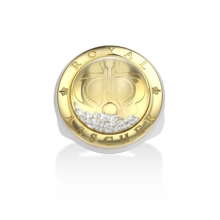 ロイヤル・アッシャーは、シリコンオイルで満たされたドームの中で、ダイヤモンドをゆっくりスイングさせ、美しい輝きを放つ革新的な技術「フローティングダイヤモンド」を開発いたしました。ダイヤモンド×ホワイトセラミック×ホワイトゴールドの多彩なコンビネーションのリングは、洗練された印象を与えます。