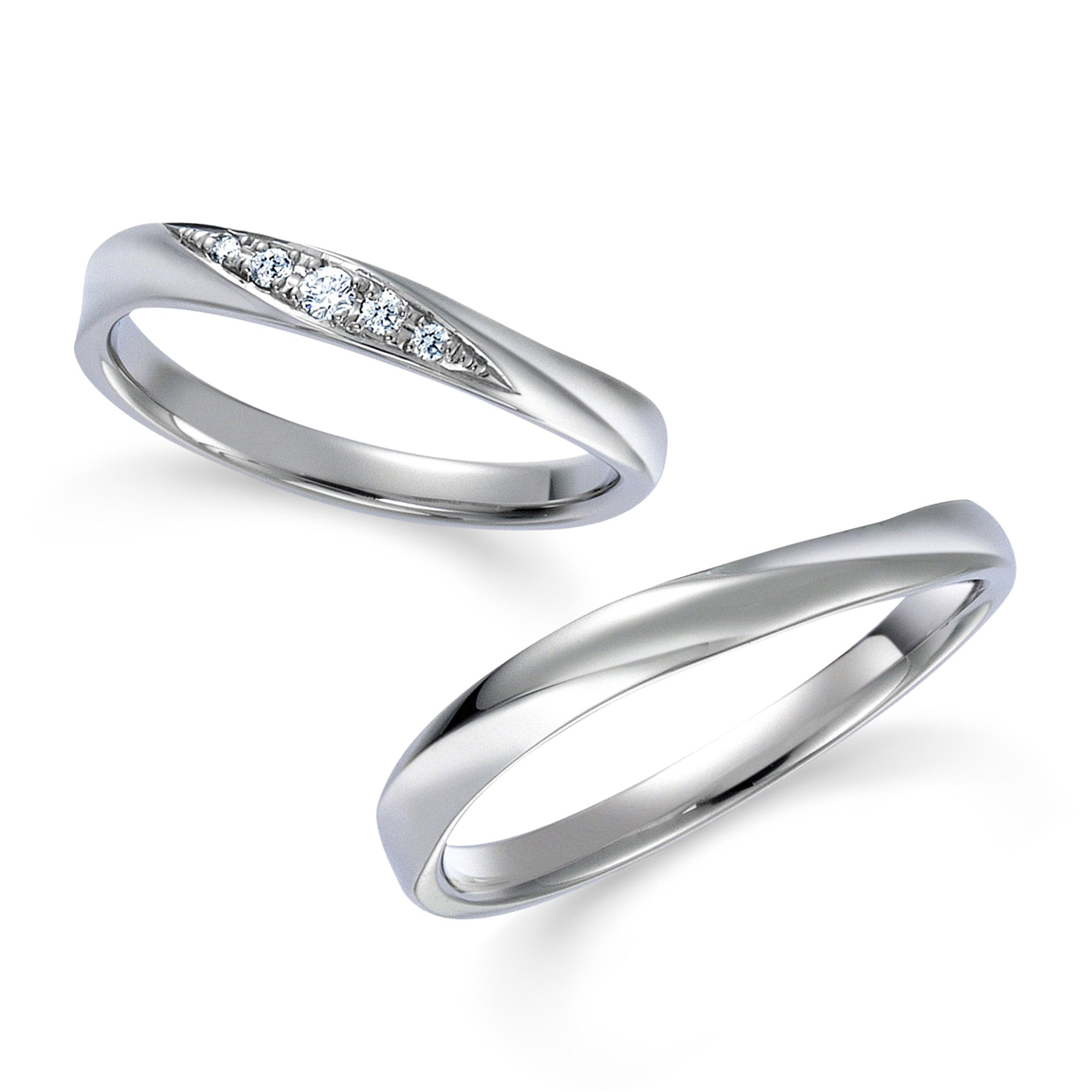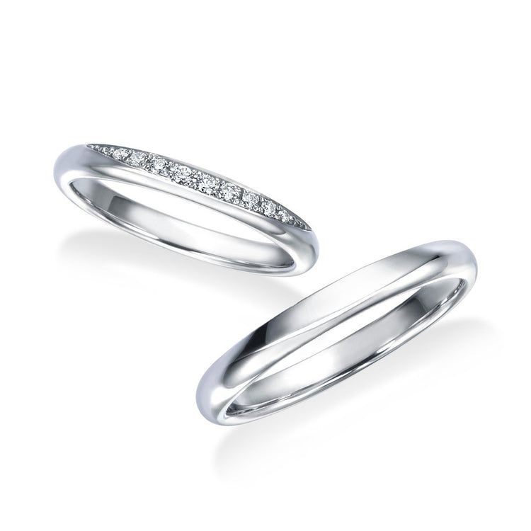 ウェーブを加えたアームはシンプルさの中にも独創性があり、こだわりのあるふたりにおすすめのデザインです。女性用のリングは、斜めに配されたメレーダイヤモンドが印象的。