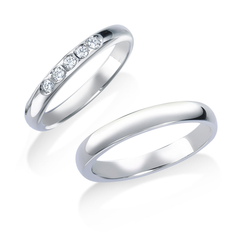 なだらかなU字を描くフォルムはエンゲージメントリングとのコーディネートがしやすいことから人気を集めるデザインです。細身のアームはダイヤモンドを大きく見せる効果もあります。