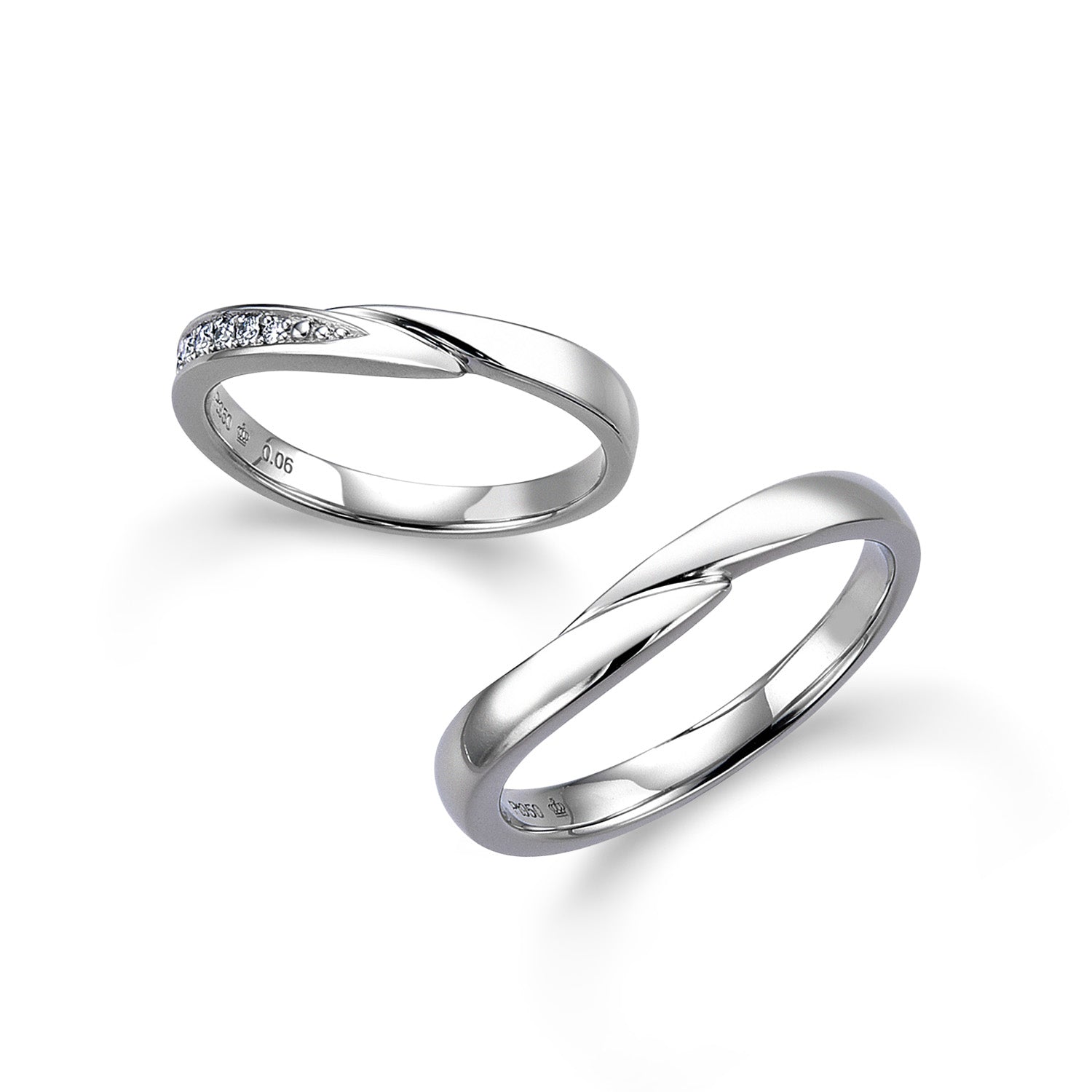 指をすっきりと見せてくれるやわらかなV字のフォルムで、男性にもなじみやすいデザイン。メレーダイヤモンドがセッティングされた女性用リングは、一粒石のソリテールリングとの重ねづけで、より華やかな印象に。