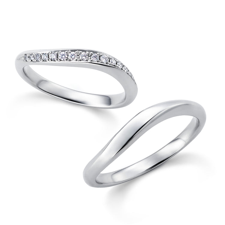 ゆるやかなカーブがやさしい印象。女性用にはセンターにメレーダイヤモンドをセッティング。ロイヤル・アッシャー・ダイヤモンドらしい優美な輝きで可憐な手元を演出します。