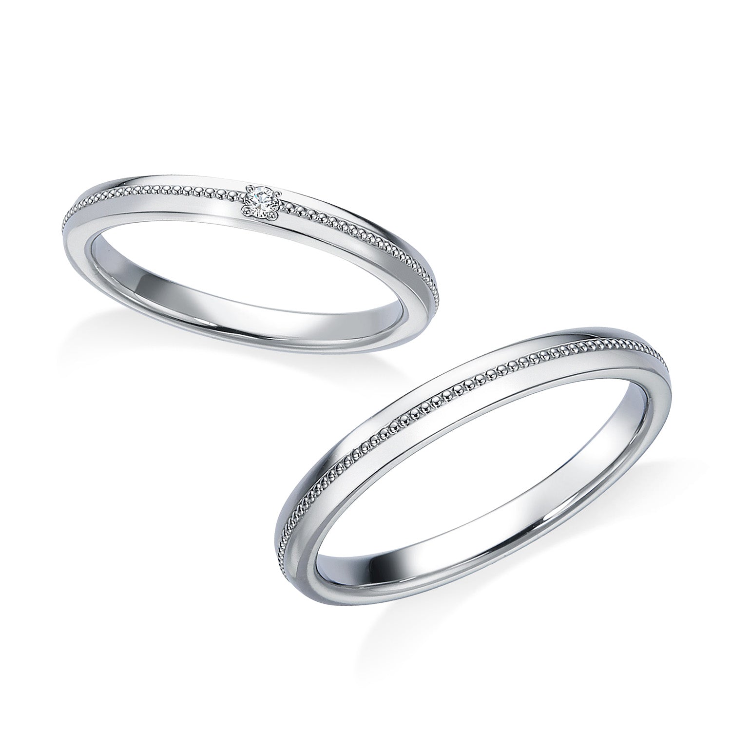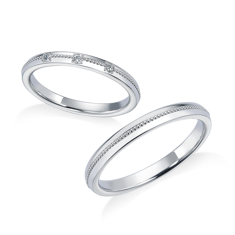 王笏をイメージしたマリッジリングは、白く無垢なプラチナに、ミル打ちのドットを施しました。ダイヤモンドが1石と3石の型、プラチナのみの型、計3型を展開します。内甲丸でなめらかな着け心地のバンドタイプのアームは、お手持ちのリングとの重ね付けにも最適。伝統を守りながらも、洗練された指元を演出します。