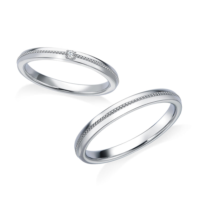 王笏をイメージしたマリッジリングは、白く無垢なプラチナに、王冠の縁飾りを連想させるミル打ちのドットを施しました。ダイヤモンドが1石と3石の型、プラチナのみの型、計3型を展開します。内甲丸でなめらかな着け心地のバンドタイプのアームは、お手持ちのリングとの重ね付けにも最適。伝統を守りながらも、洗練された指元を演出します。
