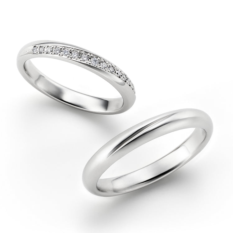 カーブに沿うようセッティングされたメレダイヤモンドが、しなやかな印象を与えてくれるウェーブタイプのマリッジリング。サイドからの見た目も美しく、華やかで上品な輝きを放ちます。