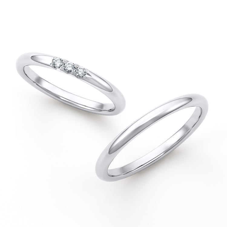 細身で重ね付けしやすいストレートライン。女性用はダイヤモンド1石があしらわれています。純プラチナの凛とした輝きは、ロイヤル・アッシャー・ダイヤモンドの白く高貴な輝きとも相性がよく、生涯にわたってご愛用いただくマリッジリングとして最適です。